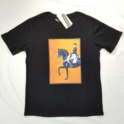 青毛の馬にドレッサージュの正装で騎乗している姿がとても凛々しいTシャツです。
